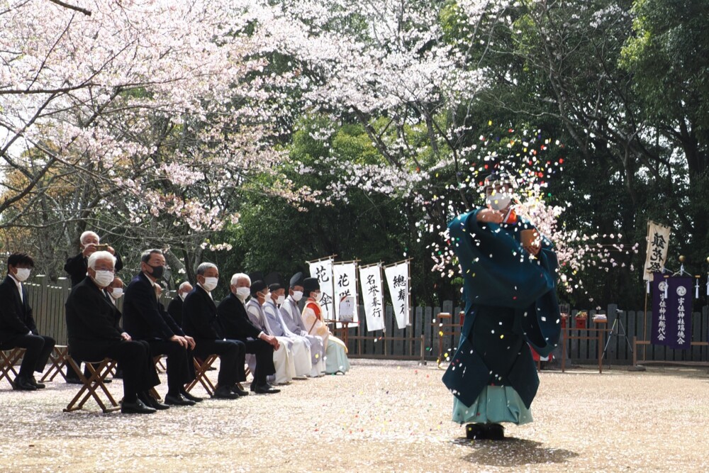 かつて桜の散る頃に多かった疫病を鎮めようと祈願する、疫神鎮遏(えきじんちんあつ)の神事。飛散する様々な悪しき流行病を桜の花にたとえて、その花びらを留めようと願う古式ゆかしい御祭儀。神社から祭場の御旅所まで、神職をはじめ舞女や花咲爺、総代会や崇敬会などの奉仕者の行列が、亀鶴公園の桜並木の下を練り歩く。