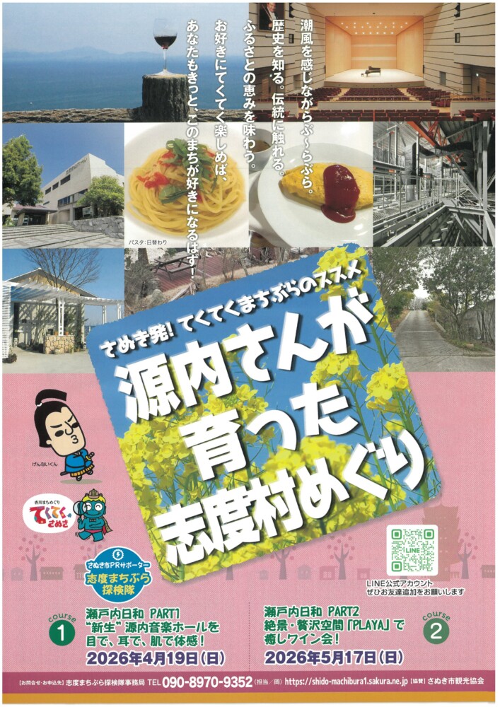 | 概要 | ※詳細はチラシをご確認ください。 コース① 瀬戸内日和 PART1 もしかして、あなたがステージの主役? “新生”源内音楽ホールを目で、耳で、肌で体感! 【参加料】2,800円 【募集人数】15人 【所要時間】約4時間 【ガイド】源内音楽ホール・志度まちぶら探検隊・演奏サポータ 【集合場所】ことでん志度駅前「ヘアーサロン・ナカマエ」 コース②瀬戸内日和 PART2 絶景・贅沢空間「PLAYA」で癒しワイン会! 瀬戸内海を眺めながらワインを楽しみませんか 【参加料】6,000円 【募集人数】15人 【所要時間】約4時間 【まち歩きガイド】当日発表 【集合場所】ことでん志度駅前「ヘアーサロン・ナカマエ」 |