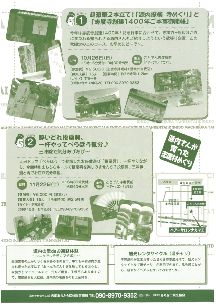 概要 | コース① 超豪華2本立て!「源内探検 寺めぐり」と「志度寺創建1400年ご本尊御開帳」 【参加料】2,500円(志度寺拝観料+昼食弁当代込) 【募集人数】15人 【所要時間】約3.5時間 / 約1.2Km 【ガイド】平賀一義 【集合場所】ことでん志度駅前「ヘアーサロン・ナカマエ」 コース② 酔いどれ投扇興、一杯やってべらぼう気分♪ 【参加料】6,000円 【募集人数】15人 【所要時間】約2.5時間 【ガイド】阿部香奈 【集合場所】ことでん志度駅前「ヘアーサロン・ナカマエ」 |